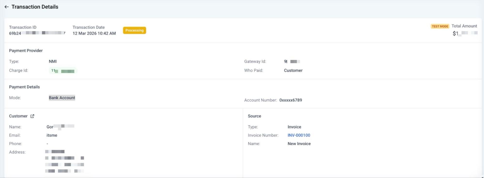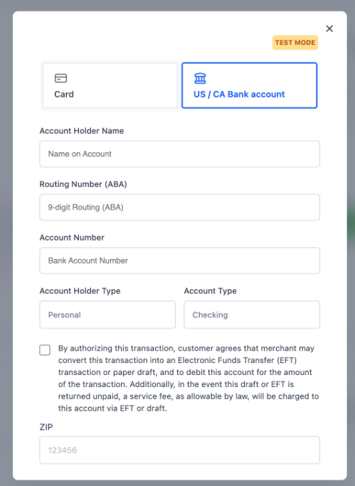supports bank transfers (ACH) for accounts based in the United States and Canada using the NMI payment processor. This feature provides a reliable alternative to credit card payments. Bank transfers often carry lower processing fees and experience fewer disputes than traditional card transactions.