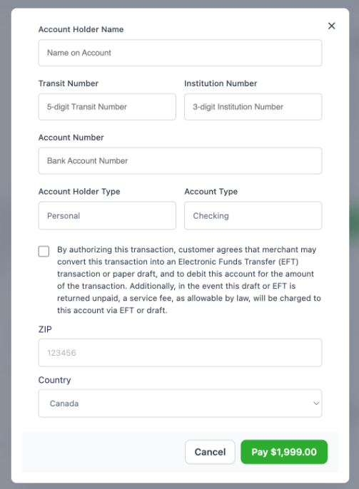 - Canada Customer View: Customers in Canada will see localized bank transfer fields compatible with Canadian banking standards.