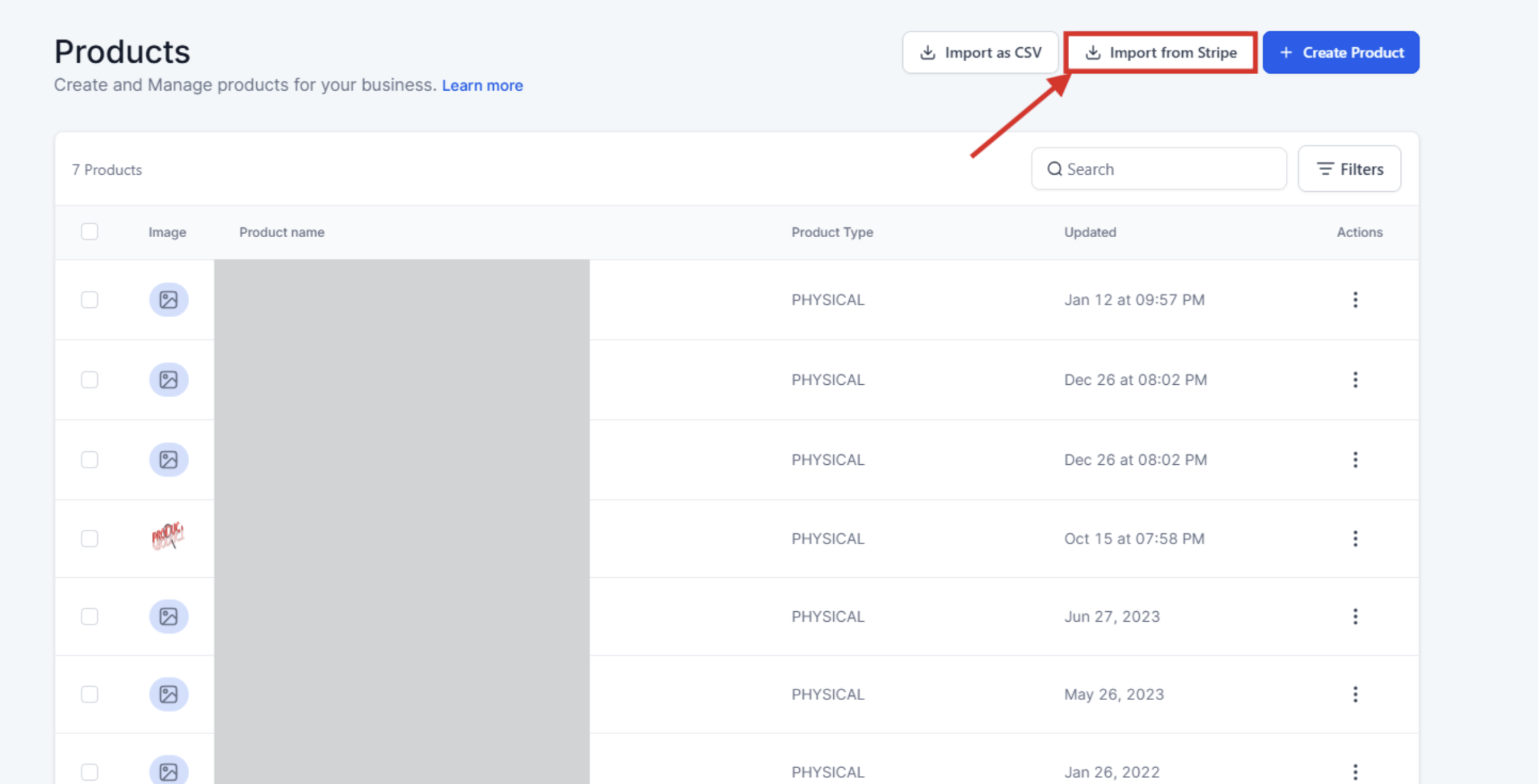 Under Payments > Products you’ll see the “Import from Stripe” button.