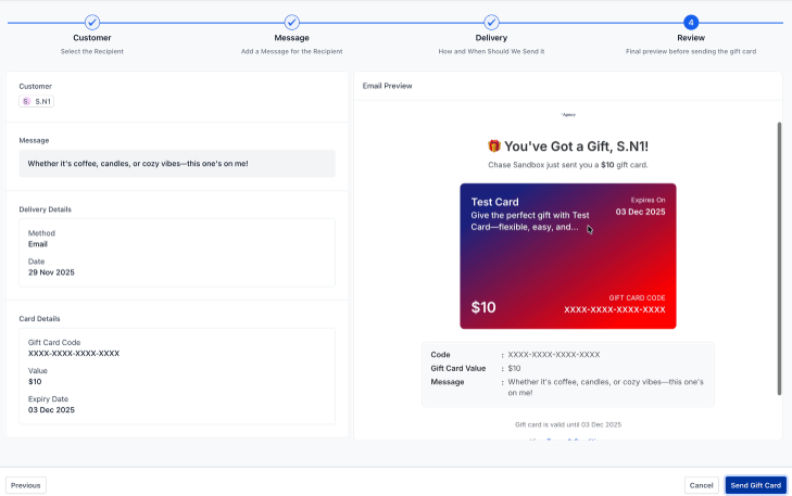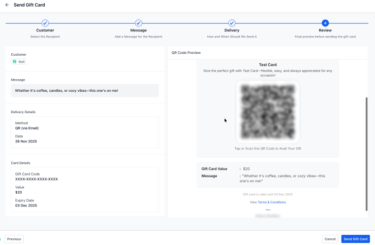 - One-to-One Ratio: The system currently supports sending one gift card to one customer per transaction; bulk manual distribution is handled individually.