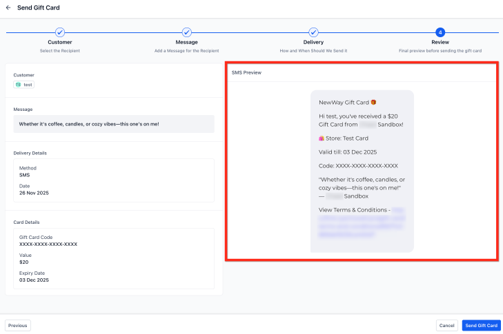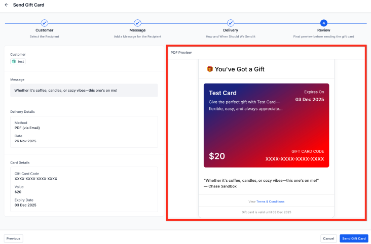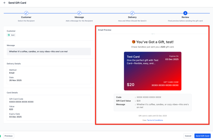 Before confirming, review the auto-generated email or SMS preview, including the gift card amount, custom message, expiry date, redemption instructions, and artwork. Then click ‘Send Gift Card.