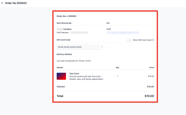 Gift Card Order Details include: