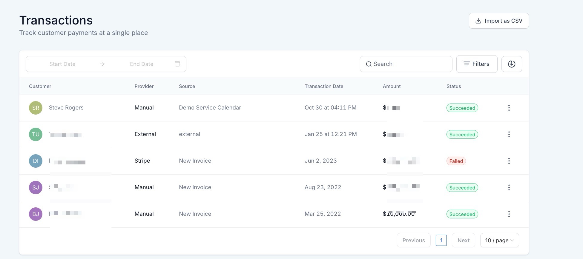 The Transactions tab of your Payments section allows you to manage all of your transactions conveniently in one spot. You can view a sortable, searchable list of all transactions, which you may also download via an Excel file.