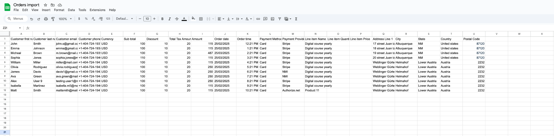 - When an order contains multiple products, the CSV displays each product’s details on separate rows, including its taxes.