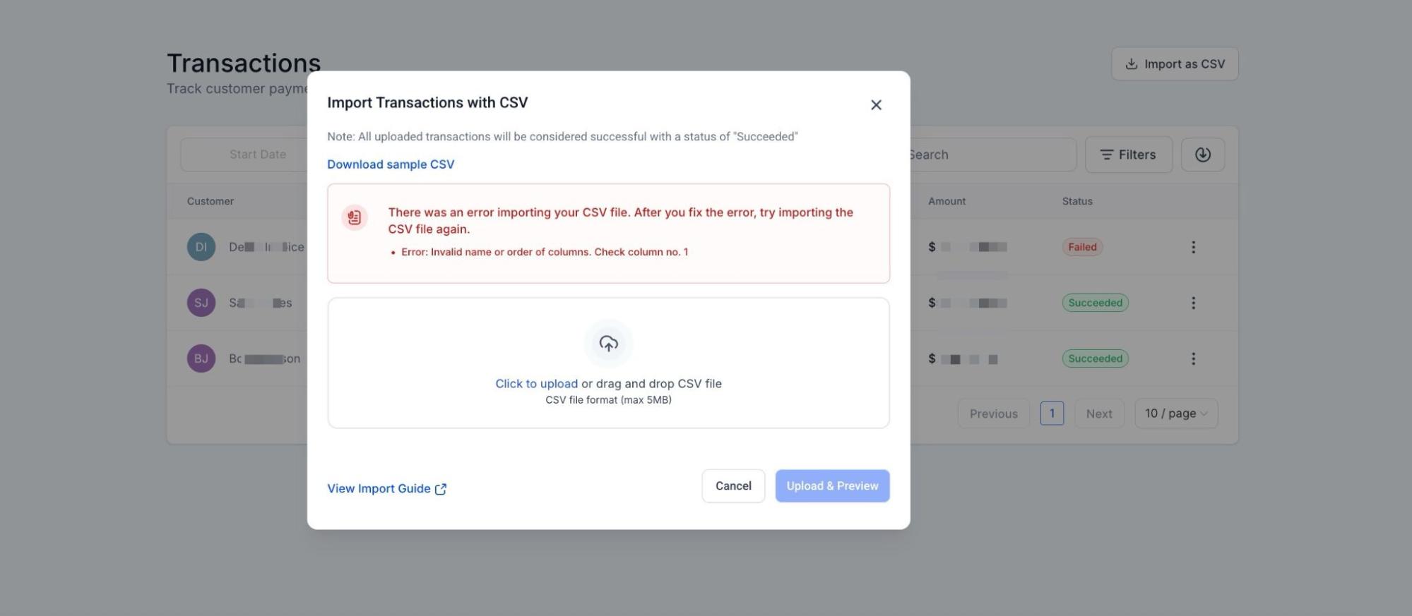 Answer: No. To ensure your revenue reporting and dashboards remain accurate, it is best to import transactions in the account’s default currency. If your CSV contains multiple currencies, the system may not apply the correct conversion rates automatically, which could skew your total revenue figures.