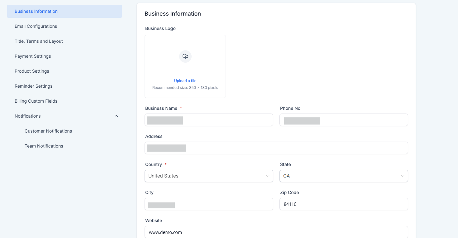 Section titled “Business Information”This menu will allow you to customize the Business information such as logo, business name, address, and website, and add custom values