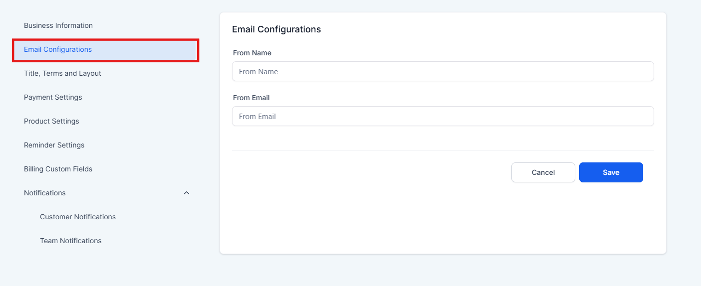 Answer: You can configure the “From Name” and “From Email” address specifically for your billing communications under the Email Configurations section in settings.