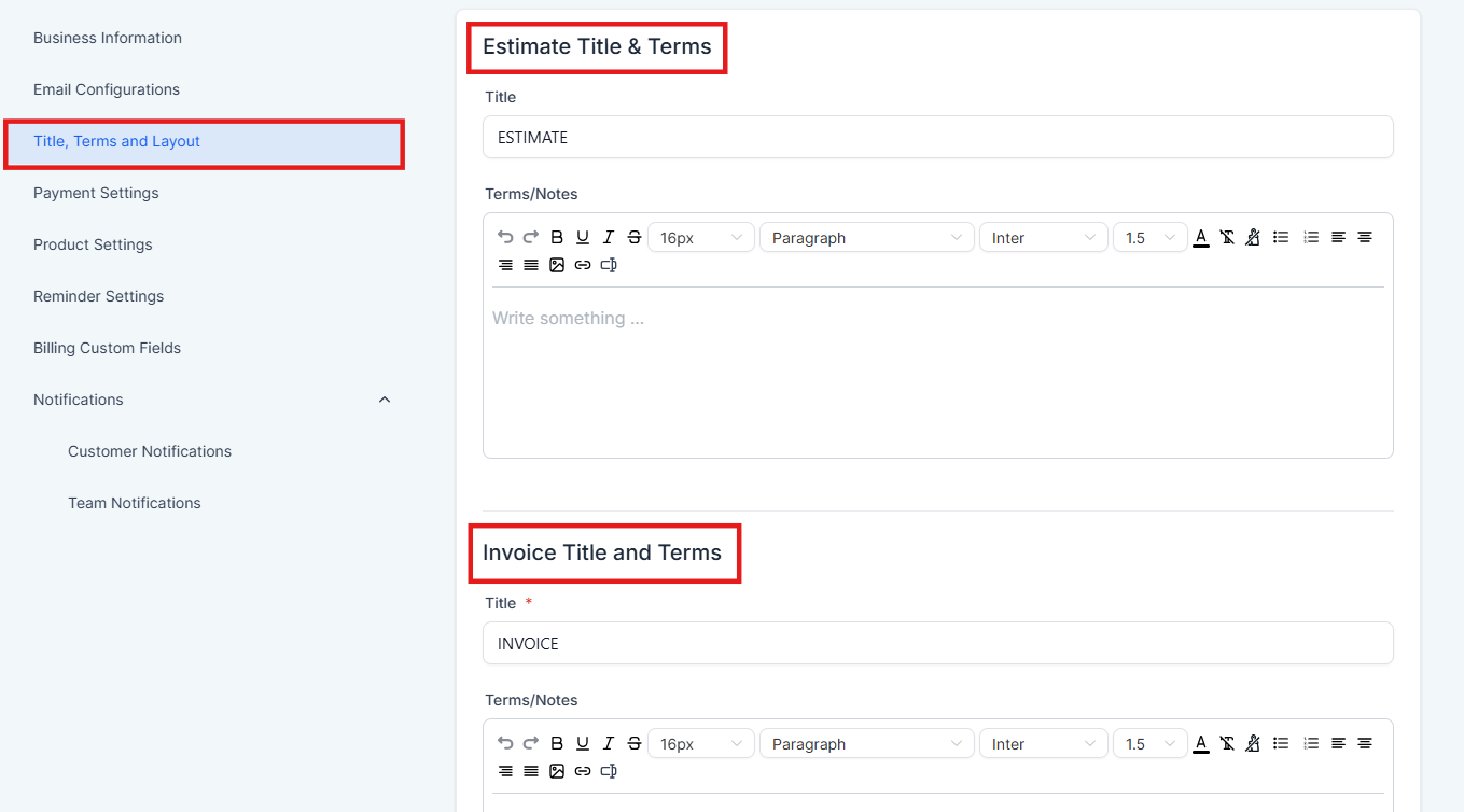 Question: How do I customize the title and terms for my invoices and estimates? Answer: To customize the title and terms, navigate to Payments > Invoices & Estimates > All Invoices > Settings. You can edit the invoice/estimate title and terms/notes here, and use various formatting options like line breaks and links.