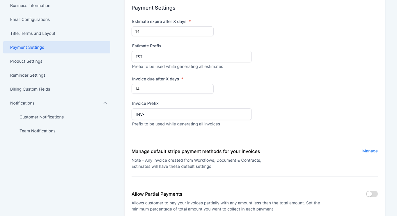Section titled “Payment Settings”Choose when the invoice is due based on X number of days and toggle the auto partial payment option.