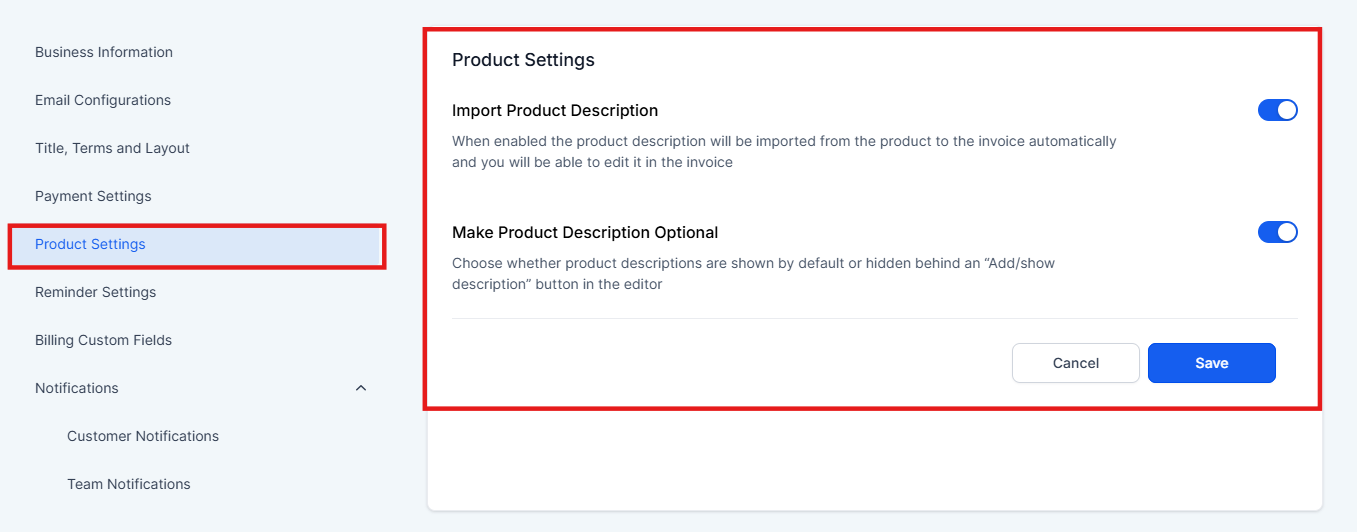 Section titled “Product Settings”When this setting is enabled, the product description will be automatically imported from the product details to the invoice. This allows you to view and edit the description directly within the invoice for easier customization and clarity.
