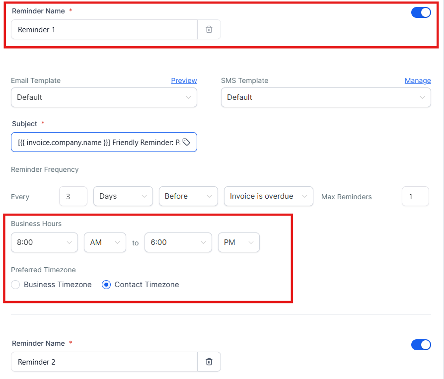 By default, three reminders will be pre-set. This ensures timely payment follow-ups without requiring manual configuration. You can disable or customize the default reminders as needed.