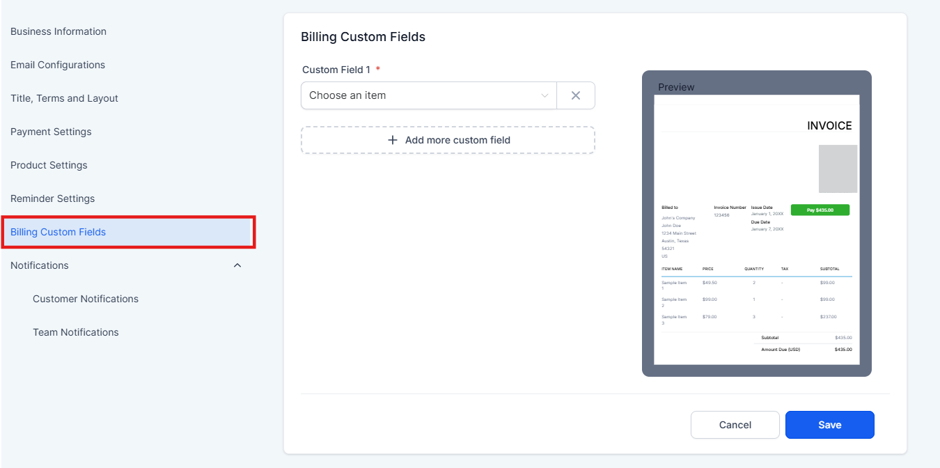 Question: Can I add custom fields to my invoices? Answer: Yes, you can add custom fields in the Invoice Settings menu under the “Custom Fields” section, allowing you to personalize invoices with your preferred information.