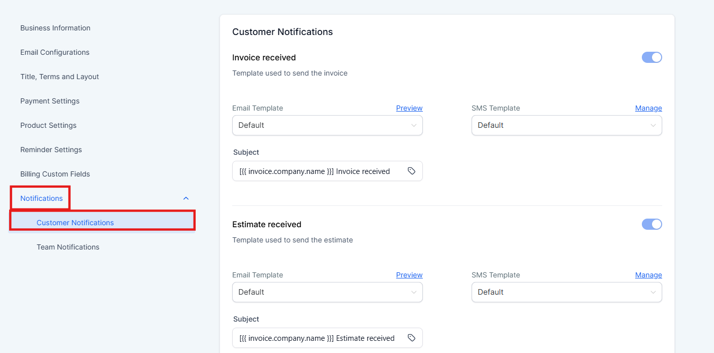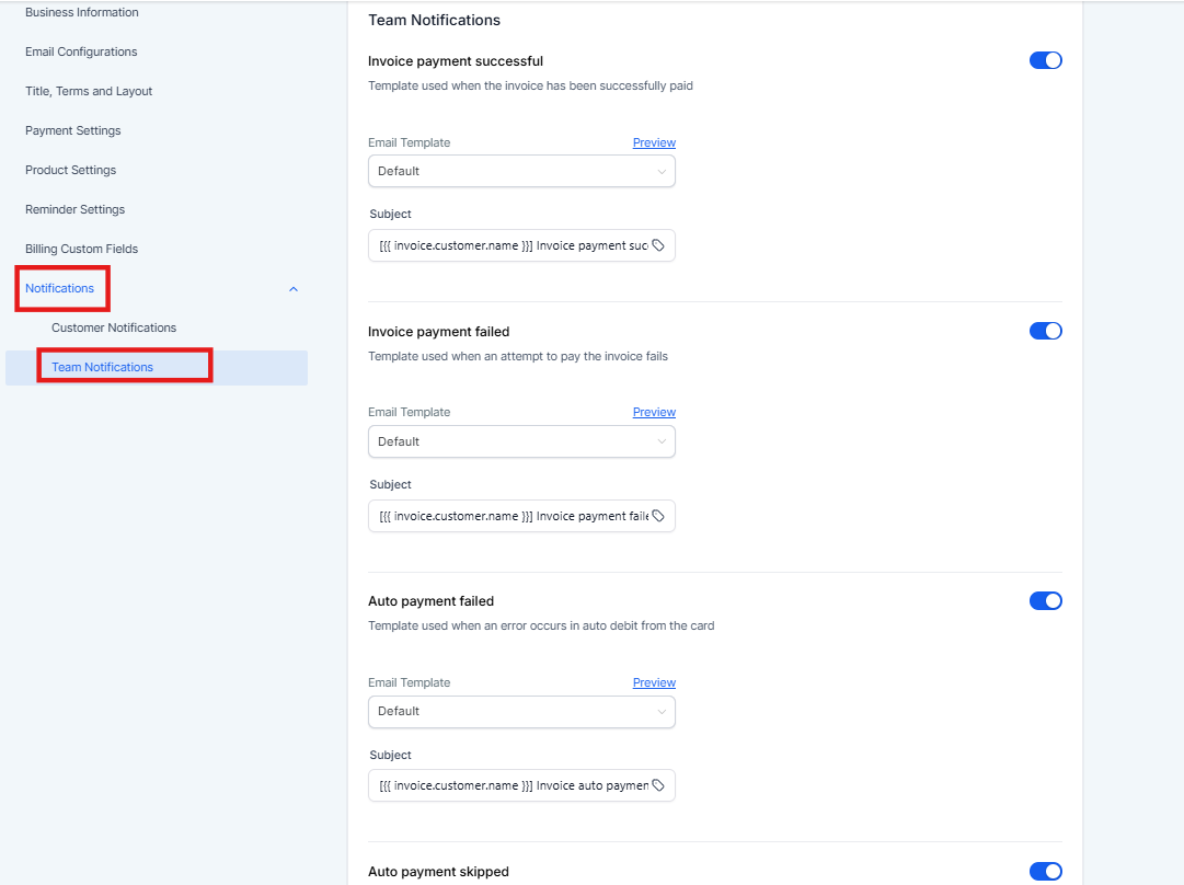 Section titled “Team Notifications”These notifications are sent to the business user who sent the invoice. Toggle on or off the type of notification and select templates as desired.