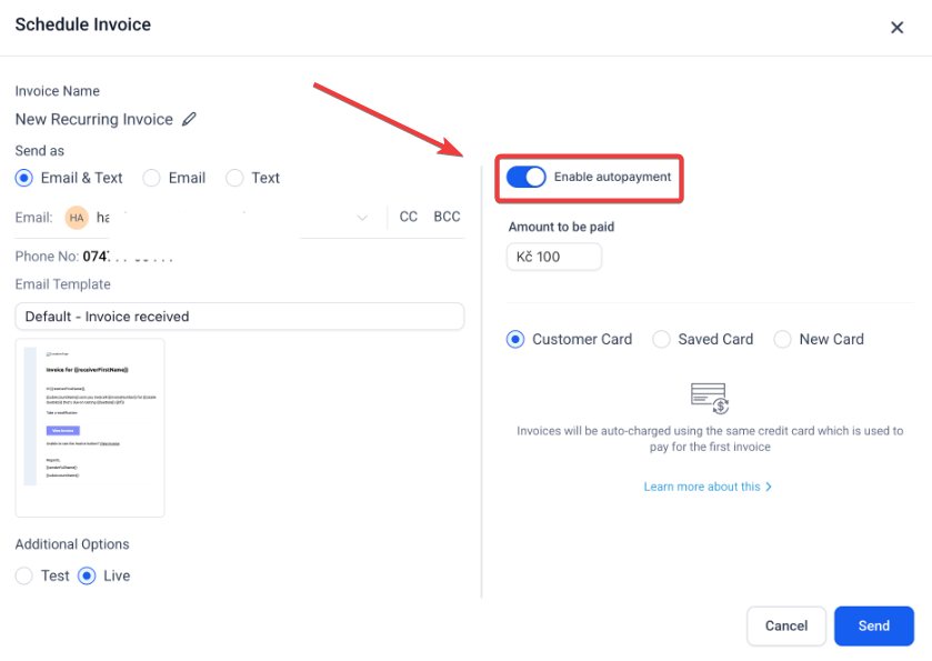Note: Autopayment is enabled by default for invoices with payment schedules and for recurring invoices created via the dashboard, eliminating the need to manually enable it each time.