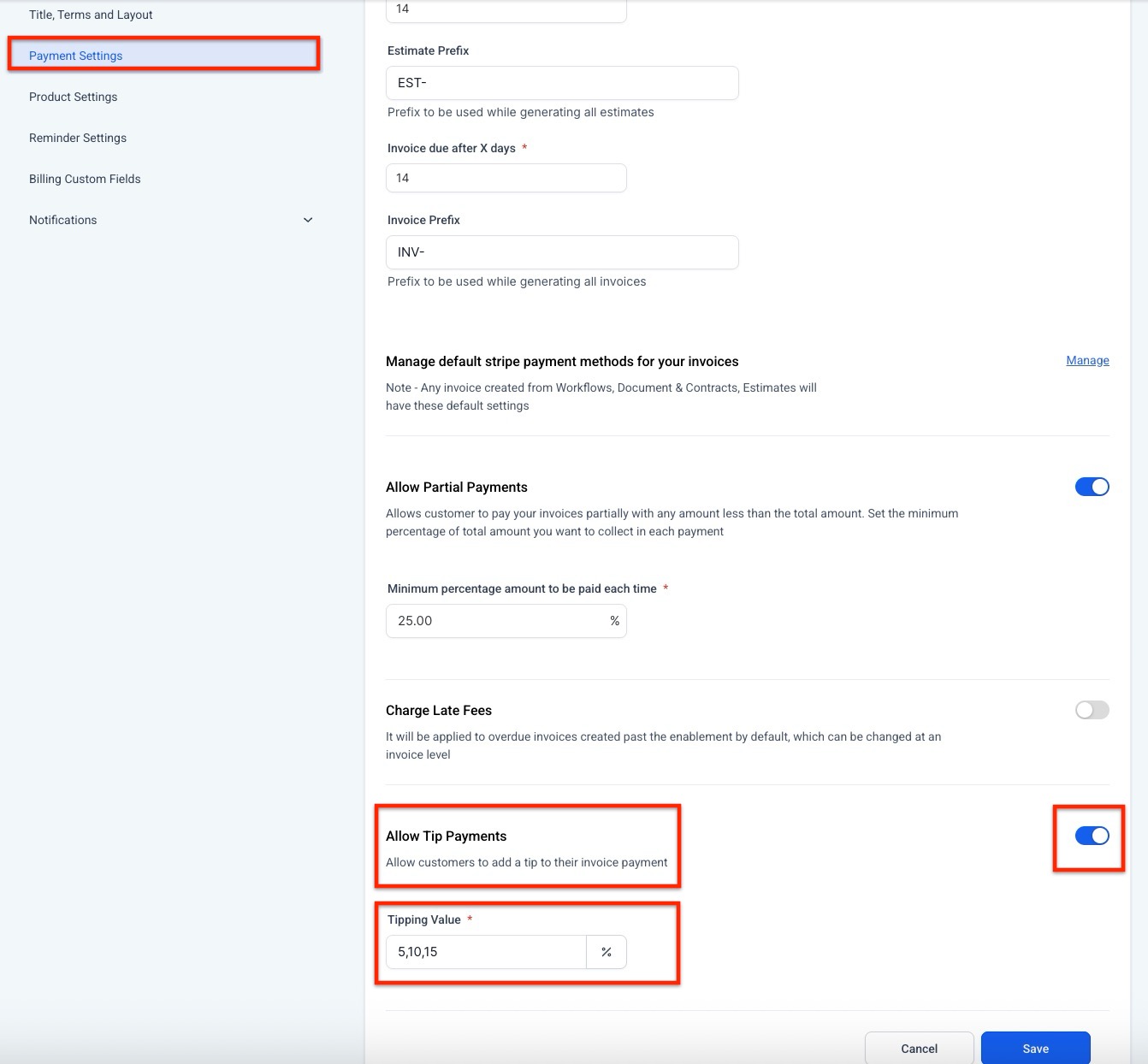 - Select the Payment Settings tab and toggle on the ‘Allow Tip Payments’ feature.