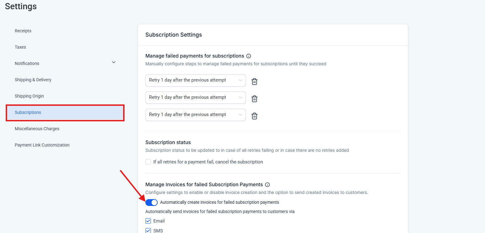 Section titled “Subscription Payment Failure Invoice Management: Customize Invoice Creation and Notifications”The Subscription Payment Failure Invoice Management feature allows businesses to configure whether invoices should be generated in the event of a failed subscription payment. This flexibility lets users choose if they want invoices sent via email and/or SMS to their customers. By default, invoices are created and sent to customers, but businesses can disable these options if needed. This feature helps streamline invoice management and improve communication with customers about payment issues.