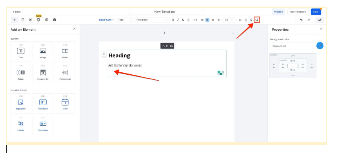 - In the template editor, drag and drop a text box or table into your document where you want to populate custom values.