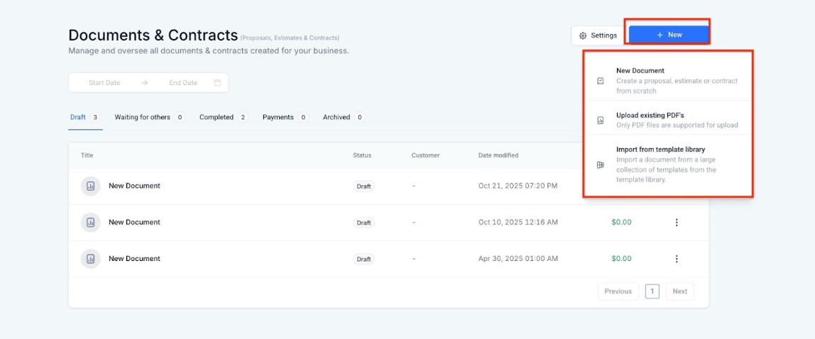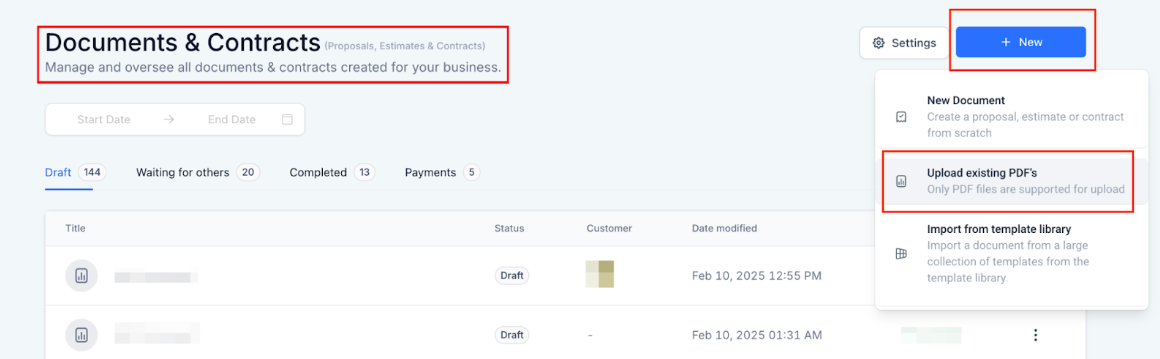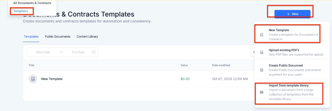 - Click on + New to add a New Document or Upload a PDF or Import from the template Library