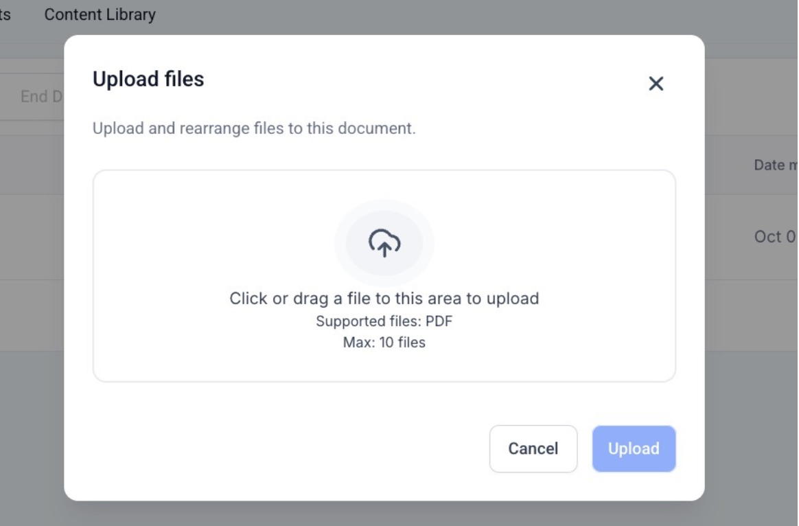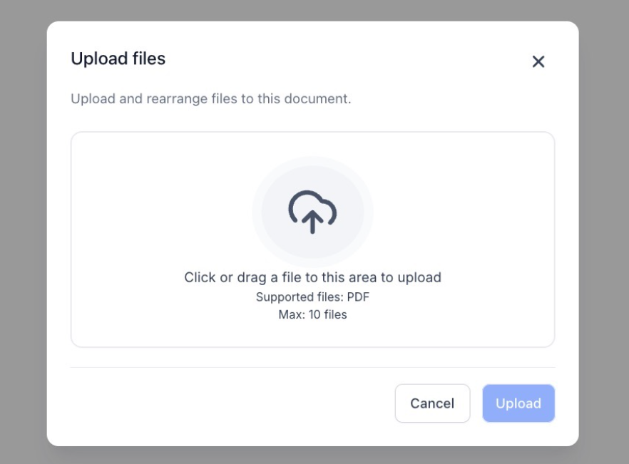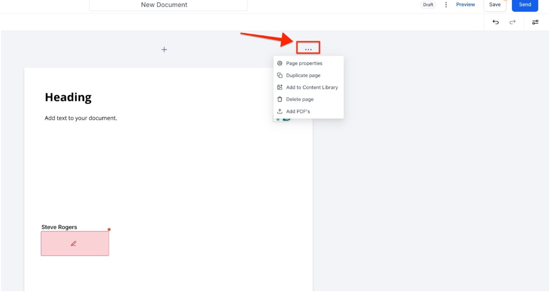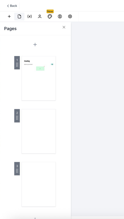 - Add PDFs to existing Documents and Templates without starting from scratch. Click the “+” symbol in the left Pages panel to add a page and upload a PDF, or use the top-right menu (three dots) and select “Add PDFs.”