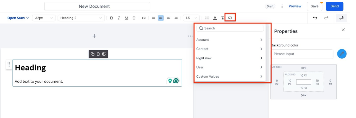 - Text: Edit the font, size, and style of your text. You can add custom fields to personalize your text more, and you can even build custom fields. This would allow businesses to auto-populate additional data stored as custom fields for contacts while sending a document/contract. The populated value will be visible on the preview link along with the download.