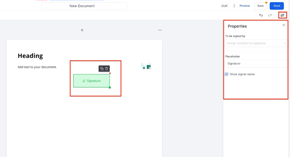 - Signature: You can select who needs to sign the document, you can edit the placeholder and you have the option to show or not show the signer’s name.