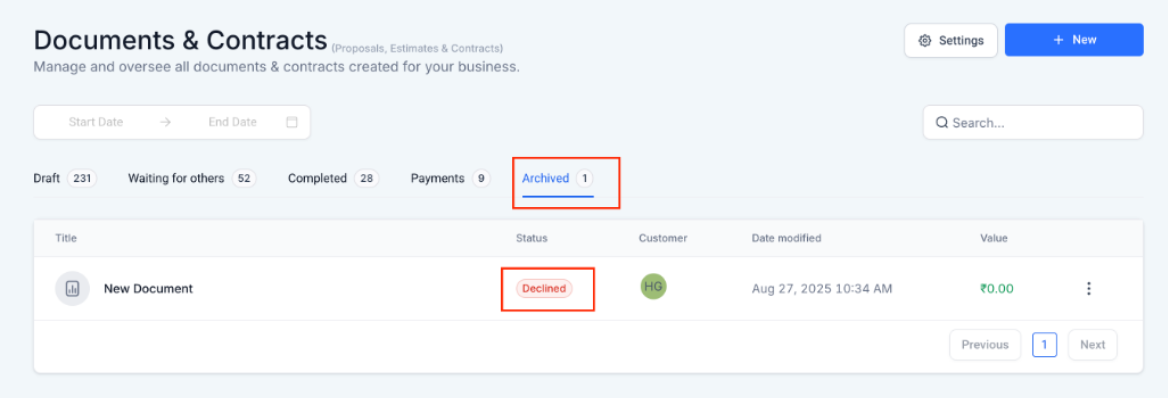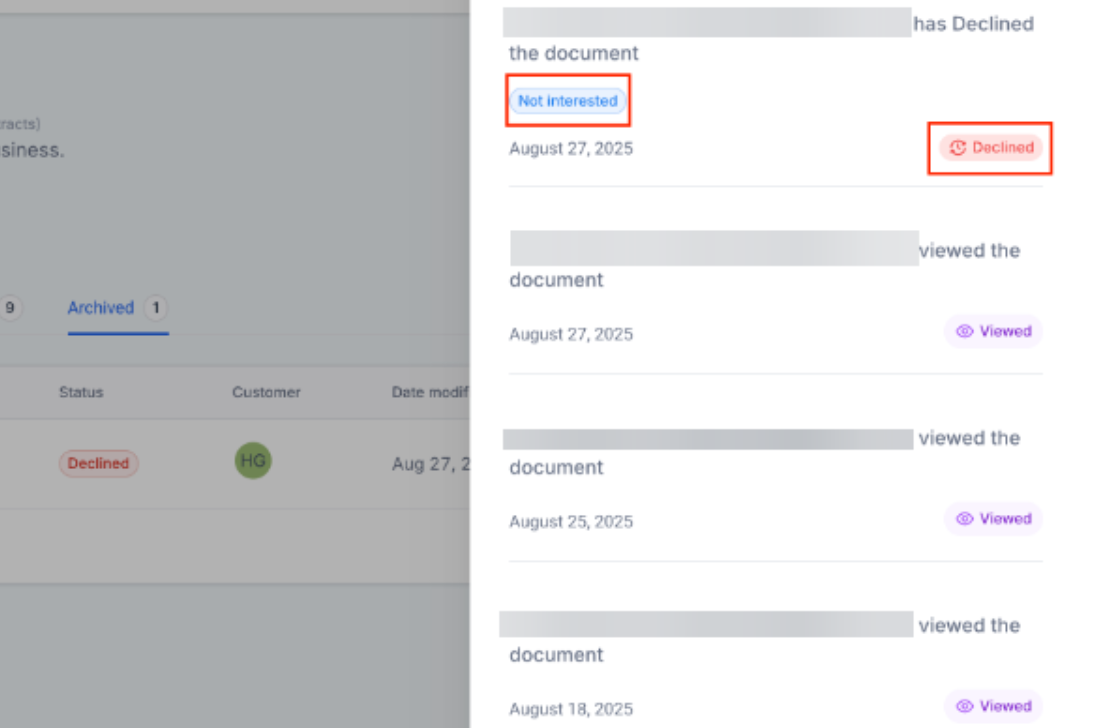 Tracking: Navigate to Documents & Contracts → Archived to view all declined documents. Click on three dots to View History on any entry to see detailed information