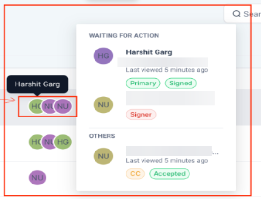 - View History: allows you to monitor the entire lifecycle of a document from sending to signing. Hover over the customer icons to see the last action time and status.