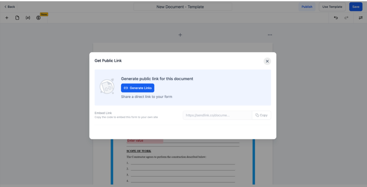 The Public Document feature allows users to create shareable documents for e-signing without adding contacts. After publishing, a unique link is generated that recipients can use to sign in by entering their name and email. A signed copy is then automatically emailed to them. For more information, please see the article, “Public Document Links for E-Signing on Contracts and Documents.”