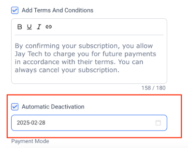 - Set a deactivation date for any payment link. Once the configured date is reached, the link will automatically become inactive.