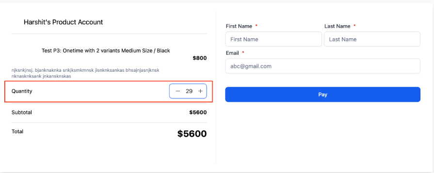 - Product Selection: Choose the product or service for which you want to create the payment link. You can bundle multiple one-time products and recurring services in a single payment link. Add your products, configure options like quantity adjustments and coupon codes, and then share the link via email, social media, or embed it on your website.