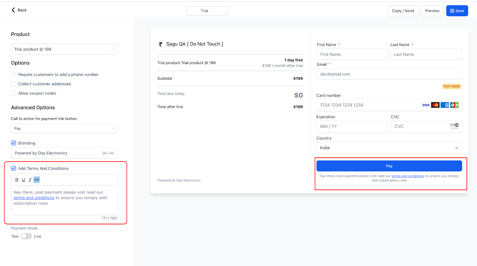 - Custom Terms and Conditions: Customize the terms and conditions displayed below the Pay button for Payment Links, allowing more control over the information presented to customers. This feature supports adding hyperlinks within the terms and conditions, directing users to detailed pages if needed.