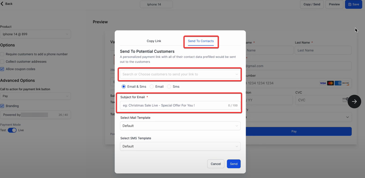 - Personalized Payment Links: To use personalized payment links, navigate to the payment link section and create a new link. Select multiple contacts from the dropdown menu to generate personalized links, then configure email and SMS templates to include these links. You can use default templates or create custom ones, ensuring placeholders for contact-specific data are included.