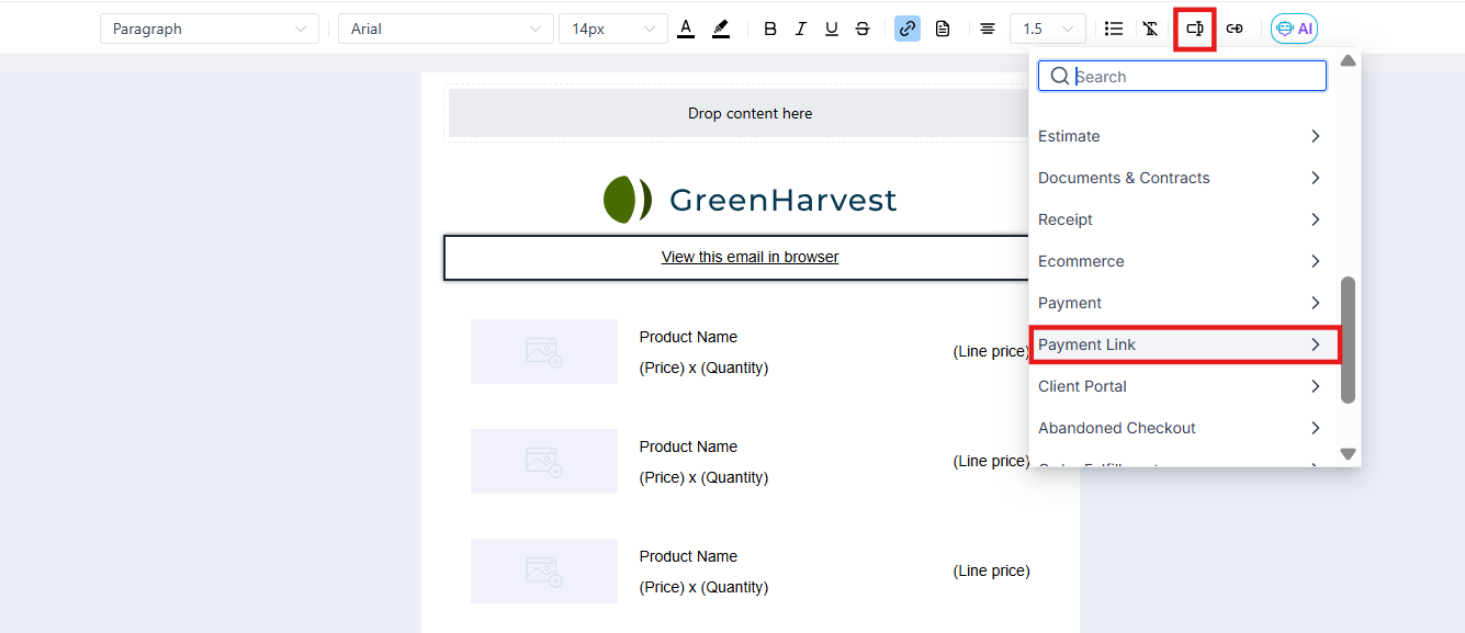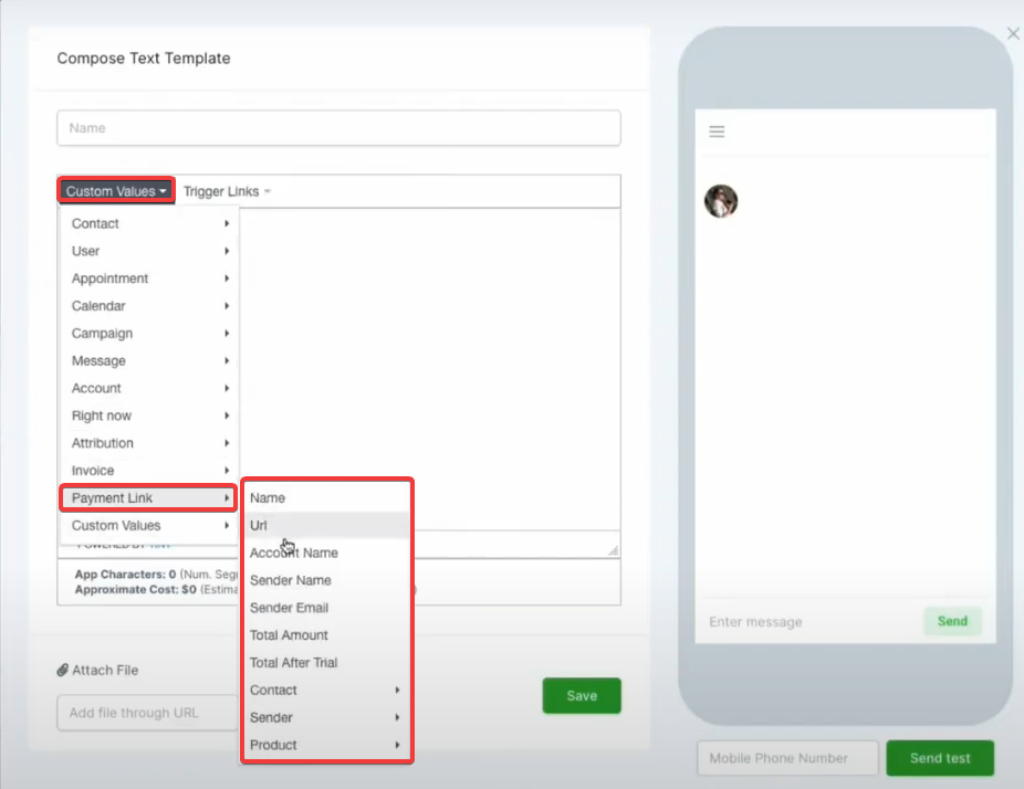 - Insert Payment Link: Use the custom values feature to insert the personalized payment link into your template.