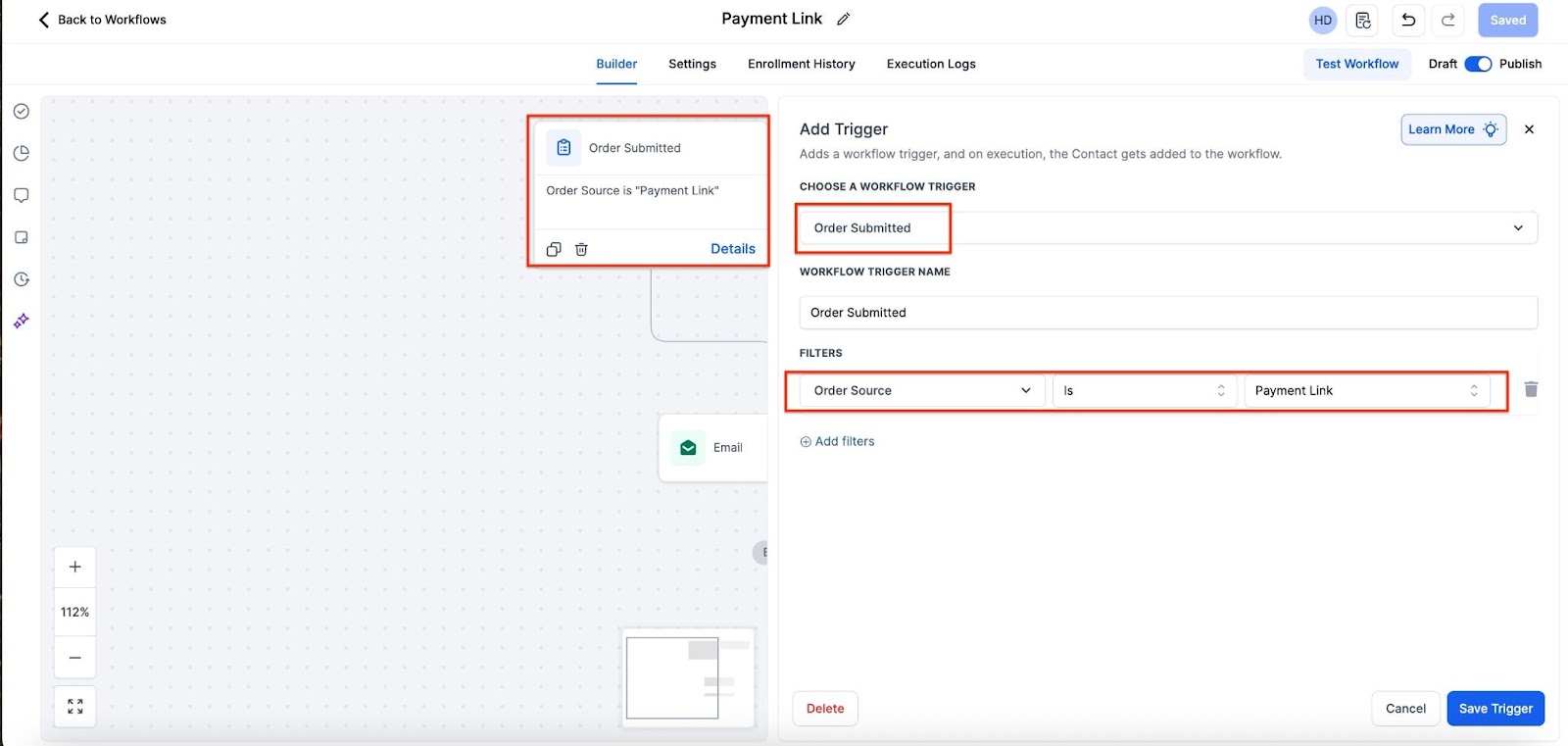 Section titled “Triggers for Payment Links”Automate post-purchase workflows using the Order Submitted Trigger for payment links, enabling tailored actions like sending confirmation emails or updating records.