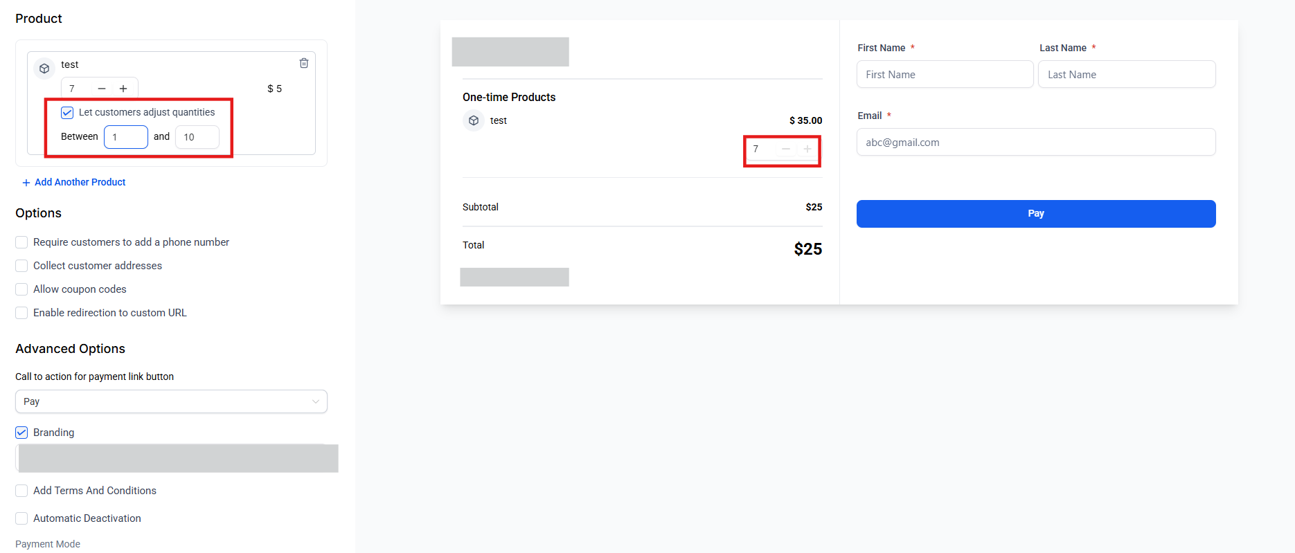 - Editable Quantities for Customers: Allow customers to adjust product quantities directly on the payment links you send them. You can set minimum and maximum limits. For example, you might set the quantity range between 1 and 10 so the customer will not be able to place an order of more than 10. Remember to save your settings and ensure the payment link is in live mode for real transactions.
