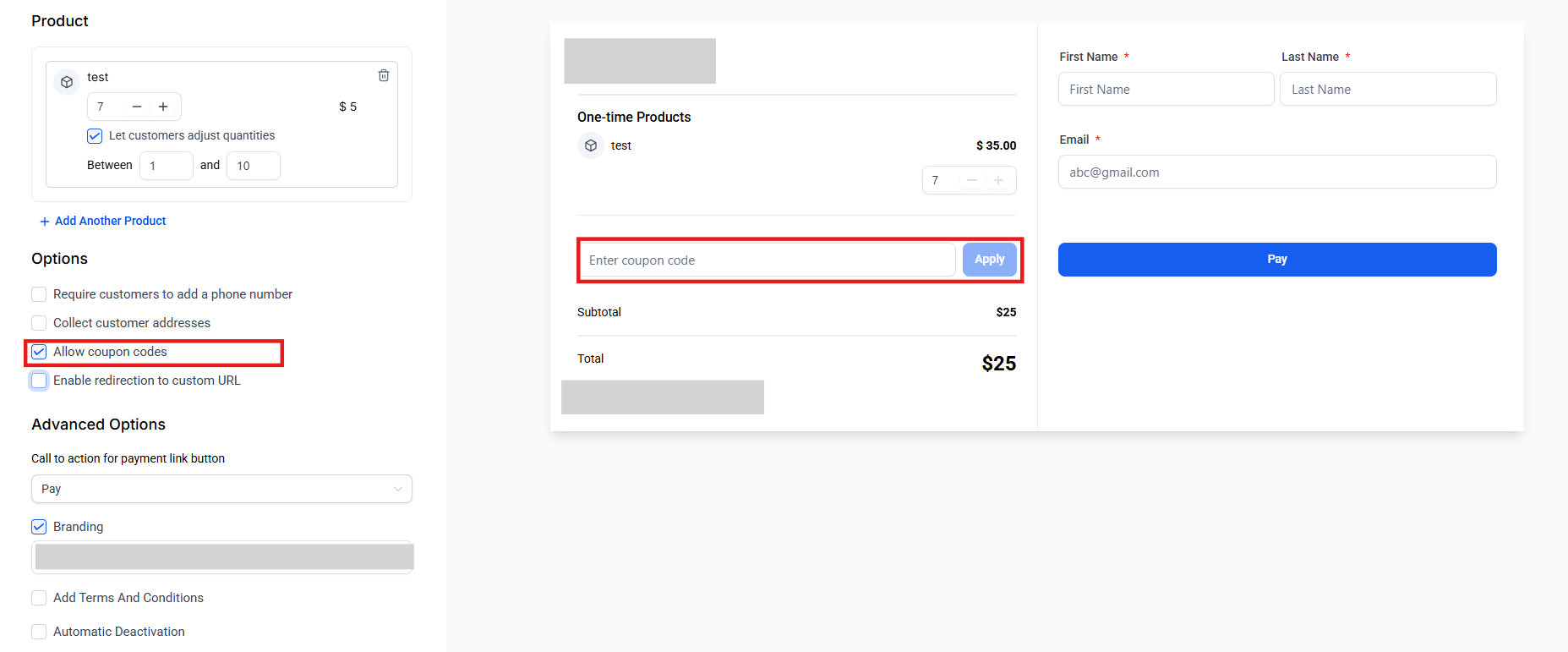 - Allow Coupon Codes: Check the option to include coupon codes. Input the desired coupon code into the designated field and save. Customers can then use the provided coupon code during checkout to avail of discounts or incentives associated with the payment link.