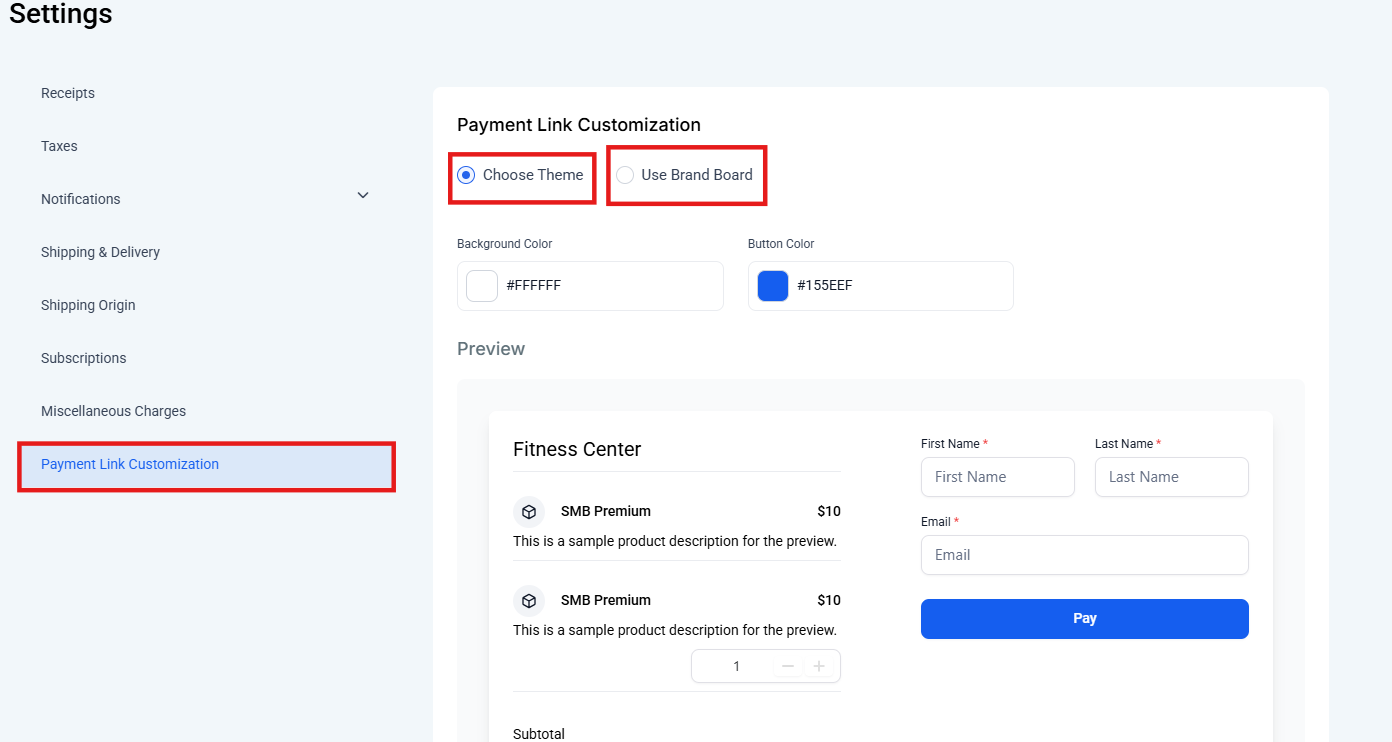 Go to the Payments section, access Settings, and choose between applying your Brand Board or customizing your colors with the “Choose Theme” option. Once saved, all your payment links will display the selected theme.