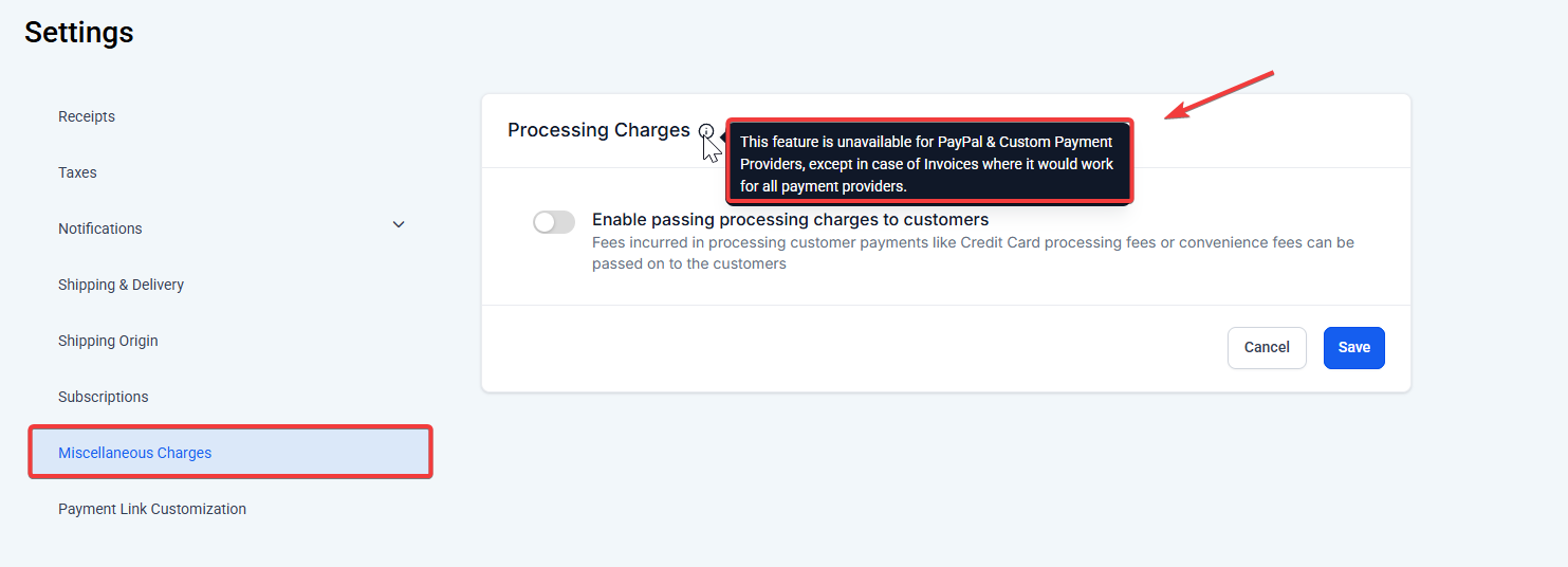 Question: Are processing charges supported for all payment providers? Answer: All providers support this feature for invoices and estimates. Other checkouts, like PayPal and custom providers, may not support it.