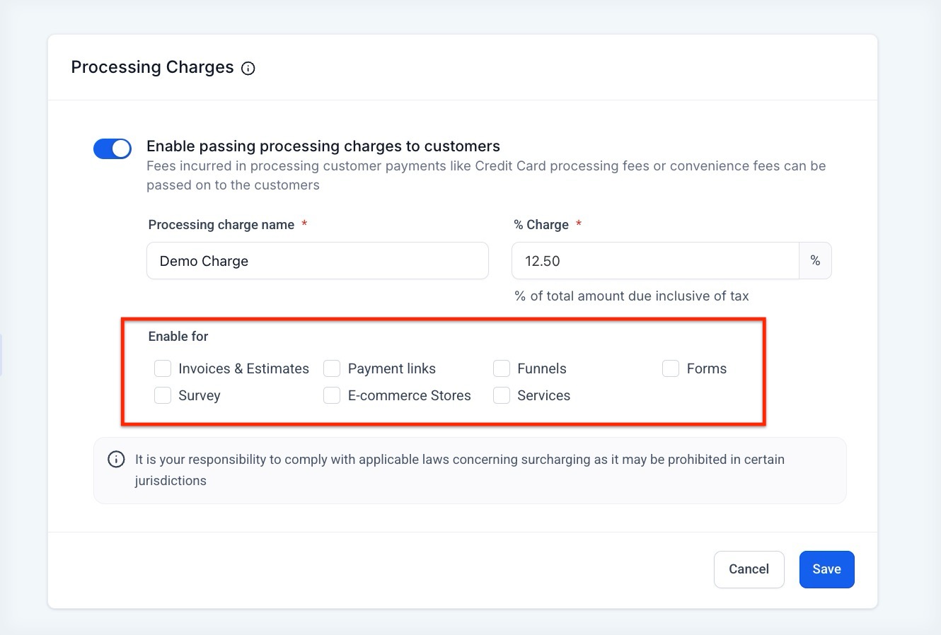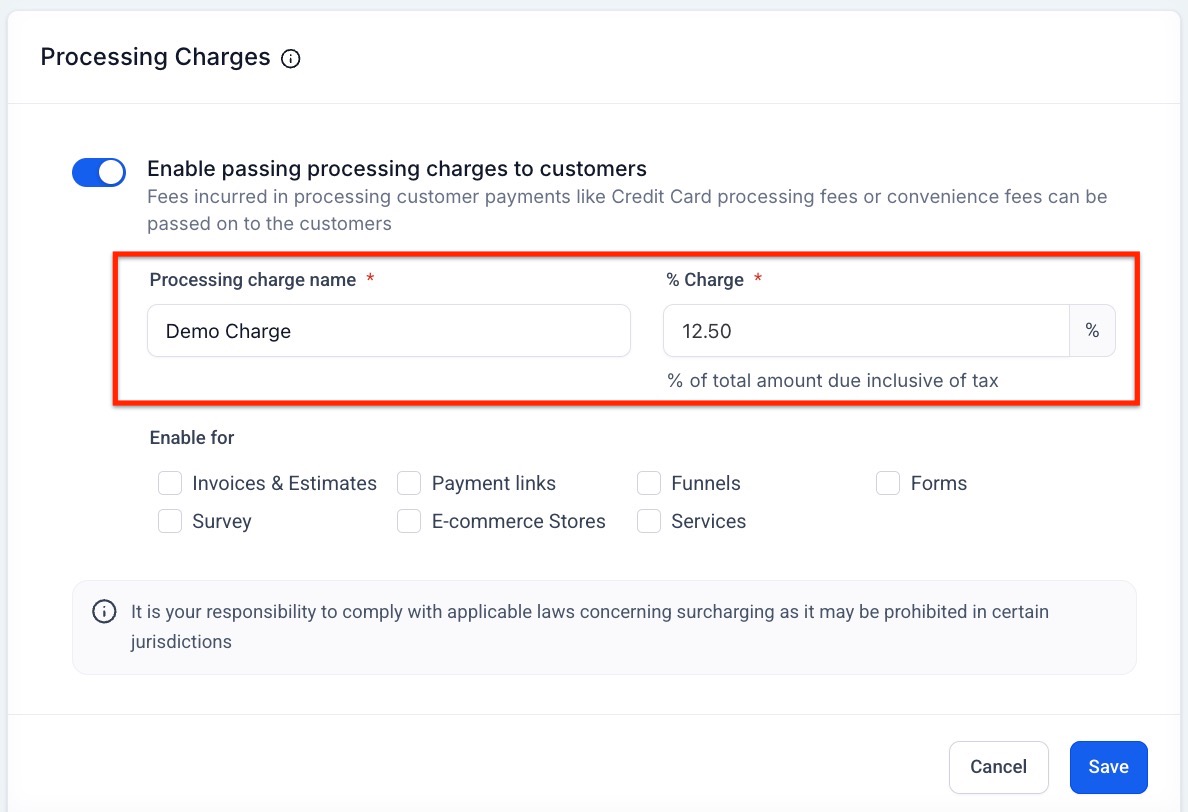 Section titled “Key Features and Benefits”- Automatic Fee Application: Apply a processing charge across multiple payment sources including invoices, funnels, forms, surveys, payment links, and estimates.