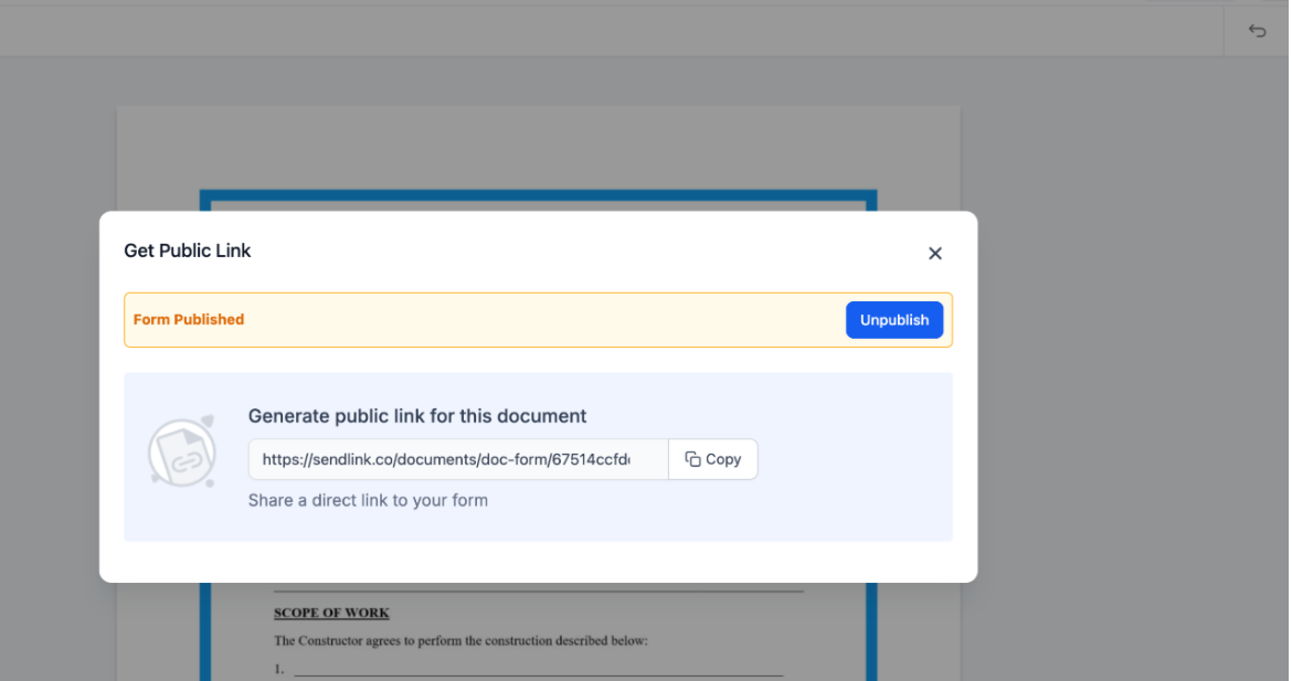 - After publishing, a unique shareable link will be generated for you. Simply share this link with the recipients who need to sign the document.