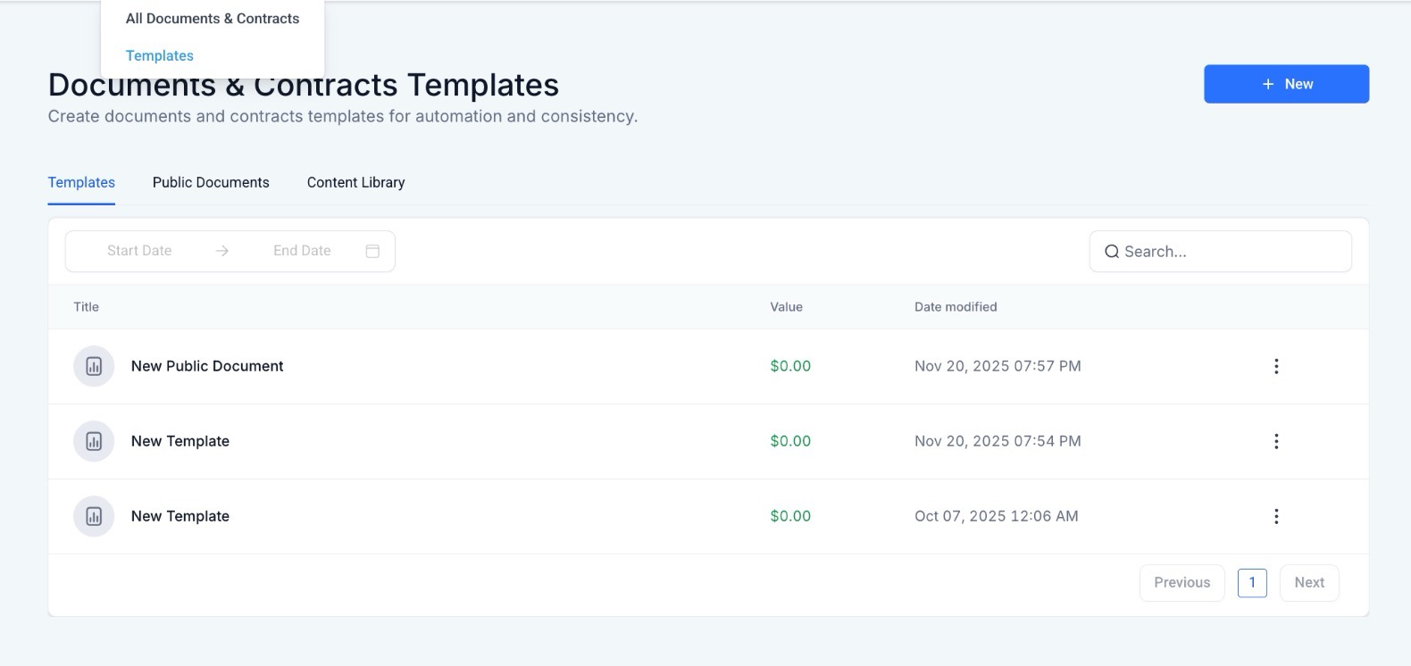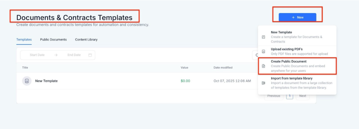 Section titled “Key Features and Benefits”- Public Document Creation: Users can create public documents for signing directly within the Templates section of the Documents and Contracts module.