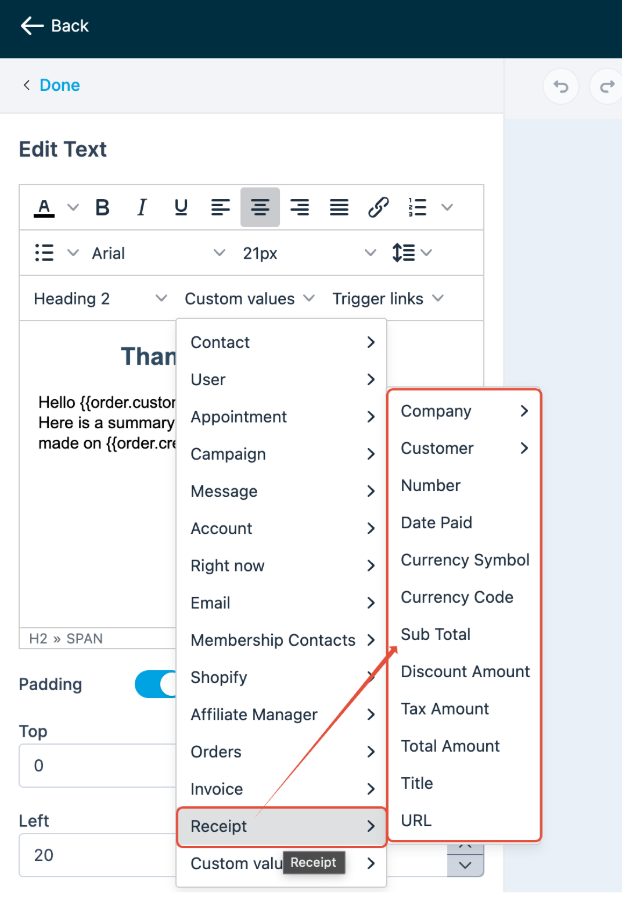 - To do this access the receipt custom values within the email builder when creating a template. These values will auto-populate based on the payment made.