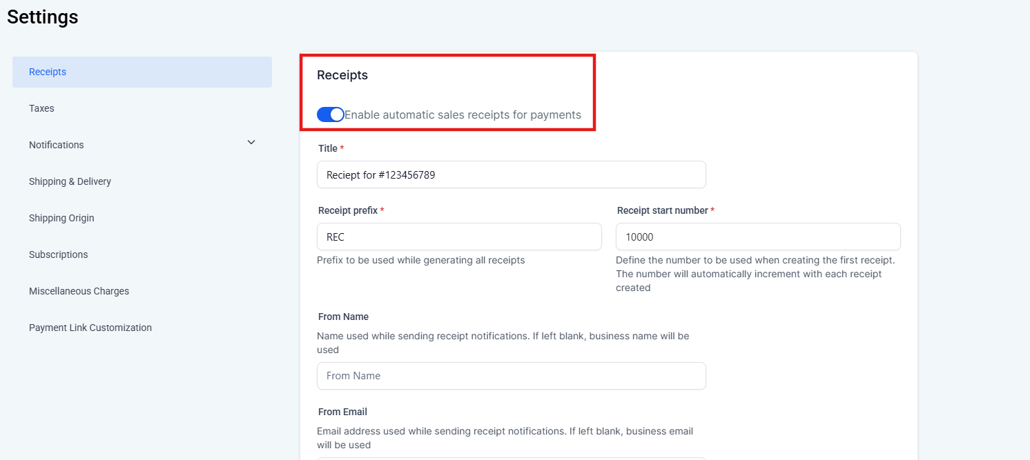 Under the Settings tab, look for the Receipts tab. Here, you’ll find a menu with a convenient toggle to “Enable automatic receipts for payments.” Switch it on to activate the feature.