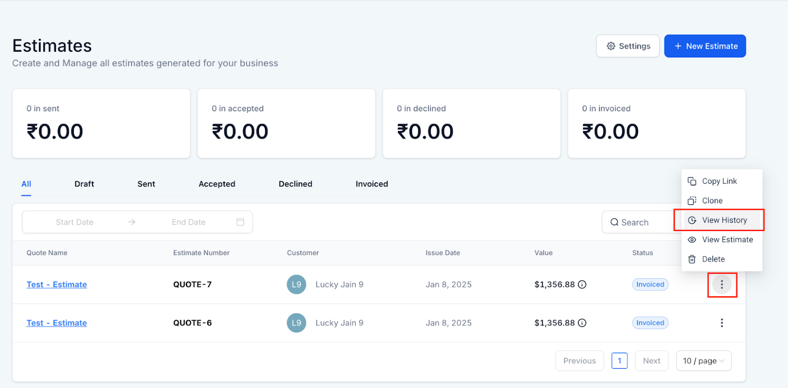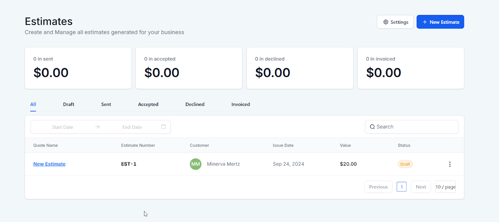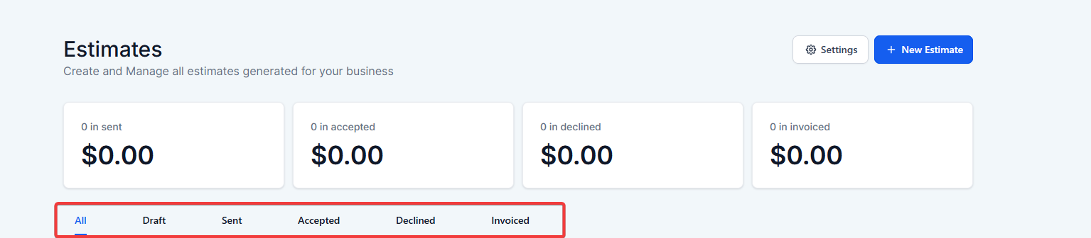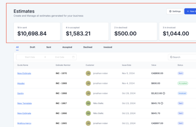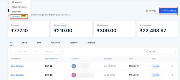 - Keep track of all estimates from the dashboard, categorized by their status: Draft, Sent, Accepted, Declined, and Invoiced.