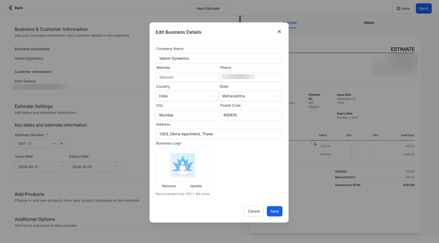 - Fill in the necessary details, including business information, customer information, estimate number, and expiry date.