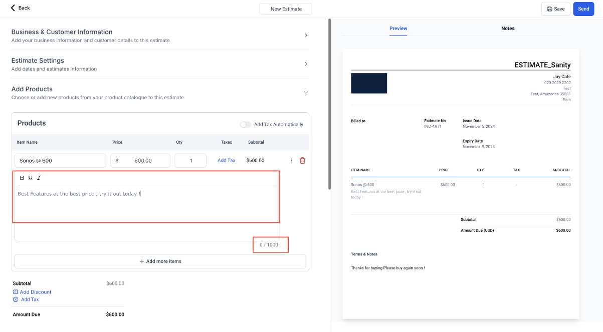 You can also import product descriptions whenever a new item is added to an estimate, ensuring consistency and reducing manual entry. This enhances accuracy and efficiency, especially for businesses handling detailed product lists, by allowing a higher character limit for descriptions in estimates.
