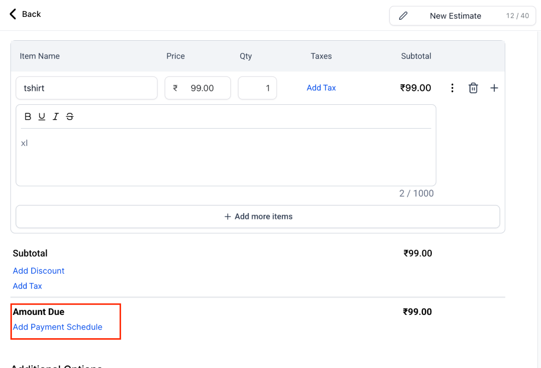 Click “Add Payment Schedule” under Amount Due, select your preferred schedule type, and configure the payment terms before adding the plan to your estimate.