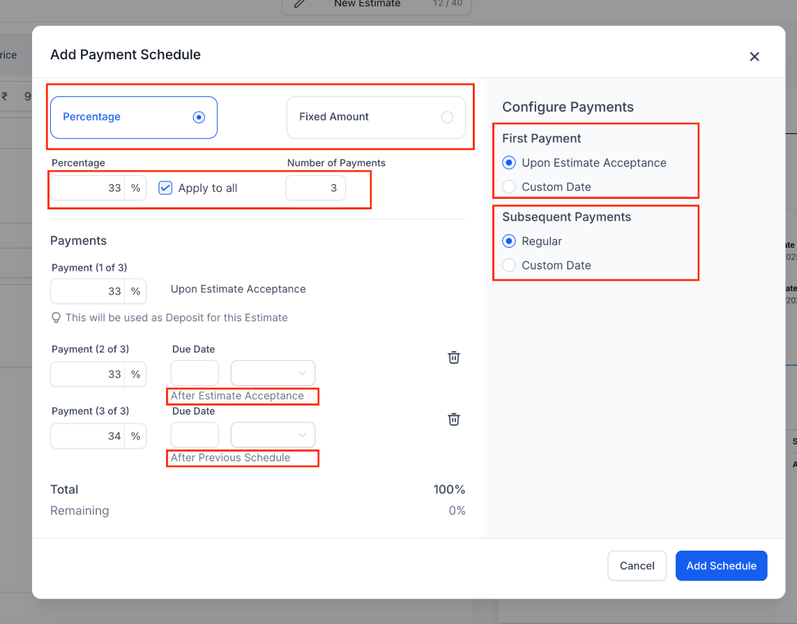 This allows you to split the total amount into multiple payments. You can choose between percentage-based or fixed-amount schedules, configure the first payment upon estimate acceptance or on a custom date, and set subsequent payments at regular intervals or custom dates.