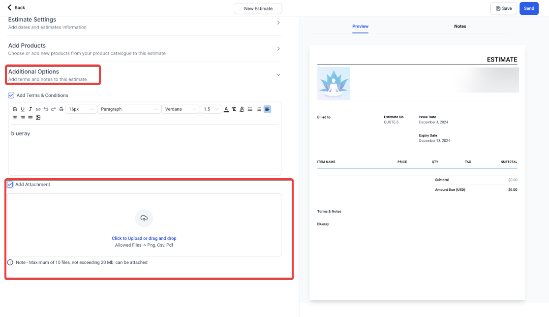 - Additionally, Users can attach up to 10 files, with a total size limit of 20MB, to estimates, invoices, and recurring invoices. Attachments offer flexibility for users to include important documents like terms, specifications, or visuals directly with estimates or invoices.