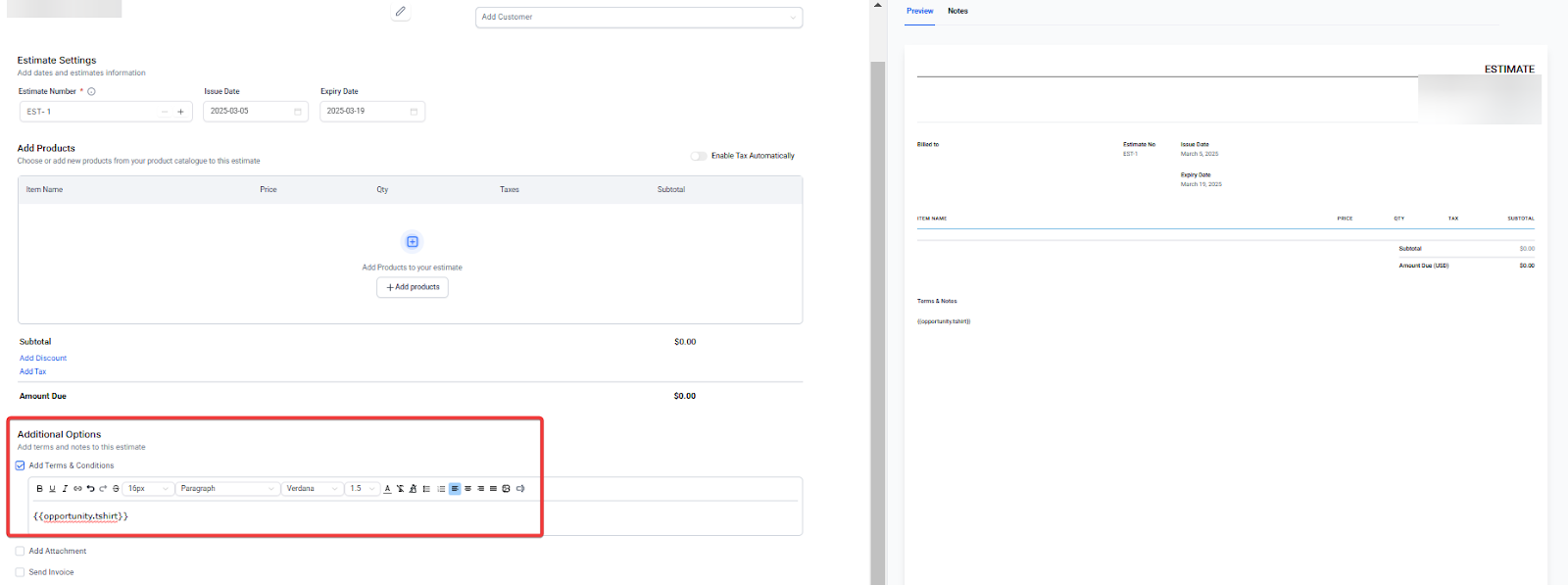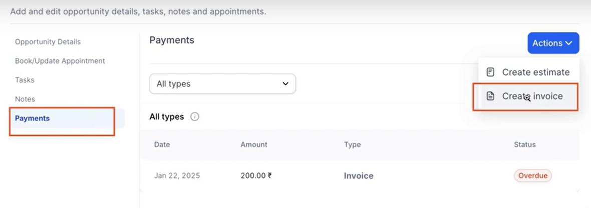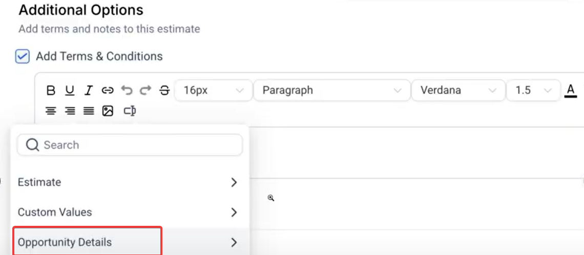 - Add Custom Values: Incorporate custom fields into your opportunities to automatically populate these details into your invoices and estimates.